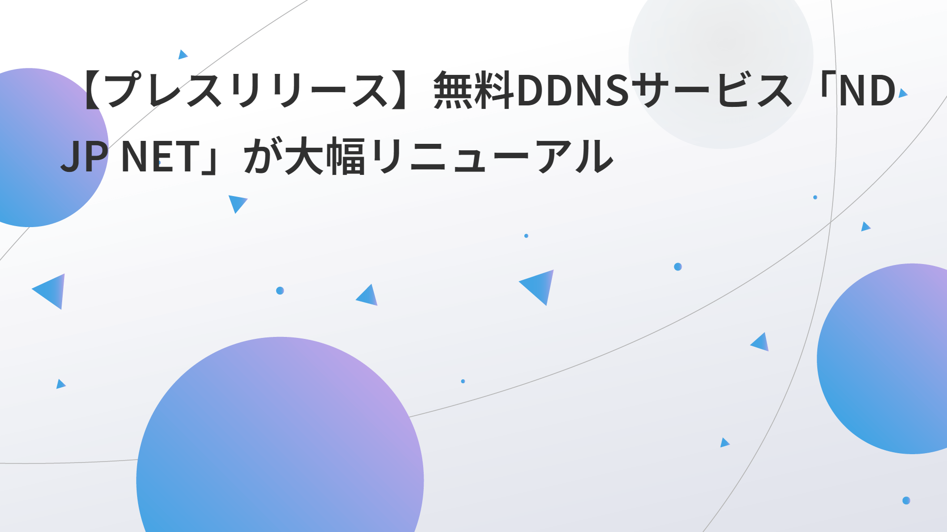 CATEGORY ニュース 【プレスリリース】無料DDNSサービス「NDJP NET」が大幅リニューアル 2026.01.07 ニュース narikakun NAKN Internet 【お知らせ】公式LINEでのサポートを終了いたしました 2025.08.20 ニュース narikakun NAKN Internet 【プレスリリース】無料で使えるシンプルなDDNSサービス「NDJP NET」を公開 2025.08.20 ニュース narikakun NAKN Internet 【お知らせ】nTool内で提供していたDDNSサービス終了のお知らせ 2025.08.12 ニュース narikakun NAKN Internet 【お知らせ】「なすきー(mi.nakn.jp)」サービス終了のお知らせ 2025.01.08 ニュース narikakun NAKN Internet 【お知らせ】「Narikakun DDNS Rental Service」サービス終了のお知らせ 2025.01.03 ニュース narikakun NAKN Internet 【お知らせ】なすきーサービス仕様および利用規約の変更について 2024.12.11 ニュース narikakun NAKN Internet 【お知らせ】「Mastodon(md.nakn.jp)」サービス終了のお知らせ 2024.11.01 ニュース narikakun NAKN Internet 【お知らせ】LINEでのサポートを試験的に開始しました! 2024.07.10 ニュース narikakun NAKN Internet 【終了済み・採用情報】 なすきー(mi.nakn.jp)運営採用情報 2024.04.22 ニュース narikakun NAKN Internet もっと見る