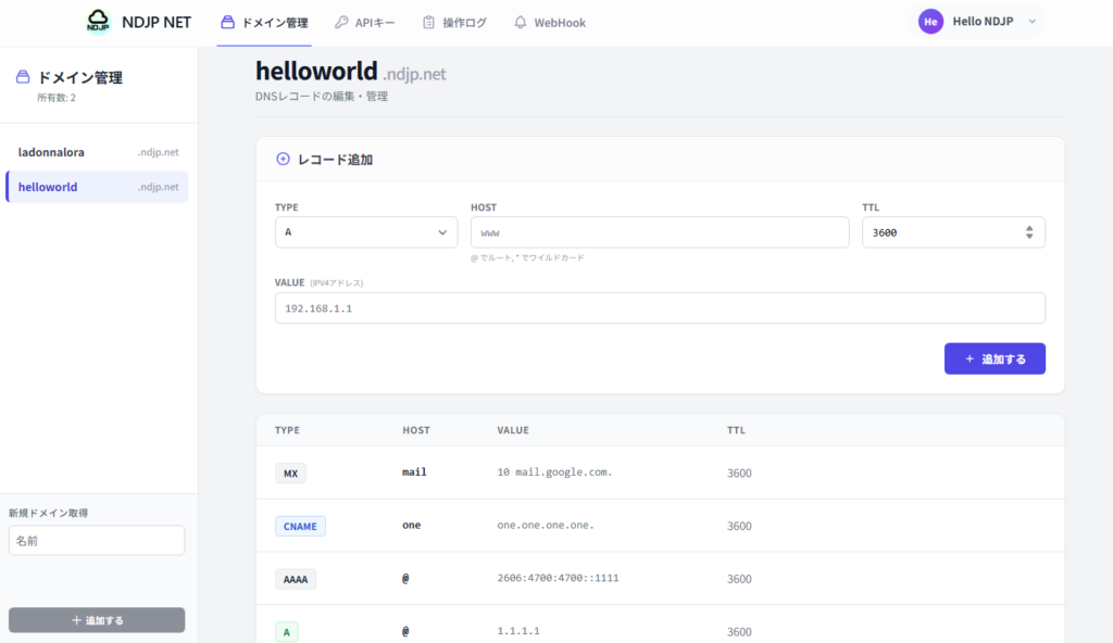・A / AAAA / MX / CNAME / TXT レコードを登録が可能(2026年1月時点)
